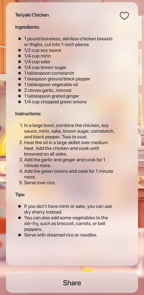 Discover a wide array of delicious recipes with nutritional information designed to support your weight management goals. Simply provide your recipe ideas, select your mealtime preference, and let our AI cooking recipes app work its magic. You will receive smart recipes tailored to your ideas, complete with ingredient lists, cooking directions, and bonus tips from the cooking assistant to enhance your dish's flavor and appeal. You can save your personalized meal recipes to the favorites list of recipe generator AI app and access it anytime, anywhere. Share your culinary creations of simple food recipes with friends and family, spreading the joy of tasty food.
