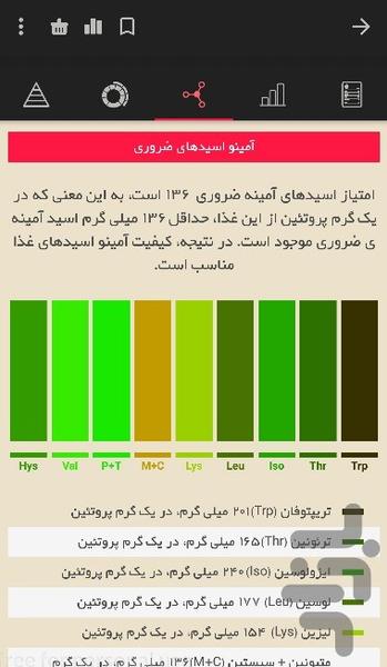 این اپلیکیشن دارای دو نما است: نمای ساده 46 ماده مغذی موجود در غذا را نشان میدهد. و نمای پیشرفته 152 ماده مغذی موجود در غذا را نشان می دهد