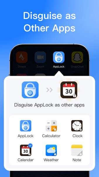 Transform the AppLock icon to Weather, Calculator, Clock, or Calendar for added privacy.