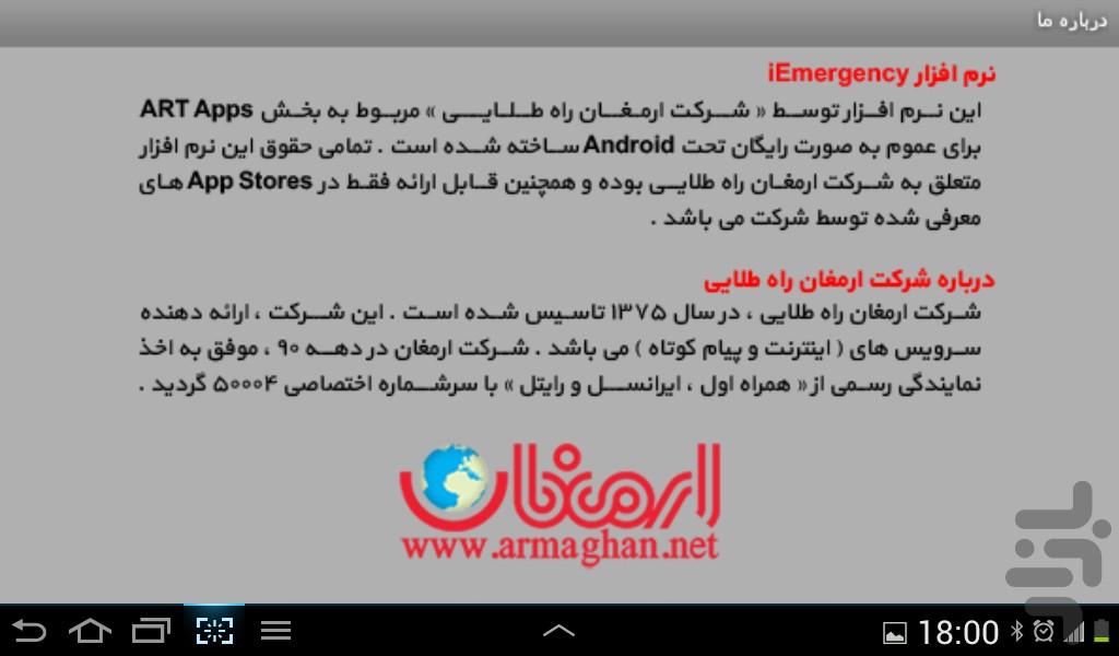این برنامه شامل اطلاعات تماس تلفن های ضروری و اورژانسی می باشد ، که به هر ایرانی پیشنهاد می دهیم این برنامه را مخصوص شهر خود دریافت نماید . همچنین ، برای مسافرت به شهر های دیگر این برنامه توصیه می شود .