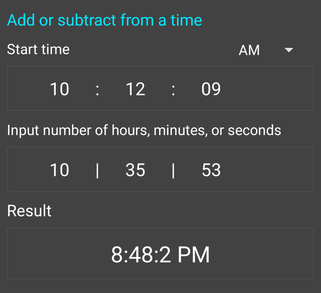 Time Duration Calc is simple to calculate time duration between times and datetimes. You also can use it to subtract hours, minutes or seconds from a starting time, add or subtract two time values.