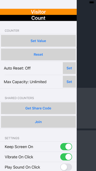 Visitor Count is simple counter, simply click "In" when a customer enters, and "Out" when a customer leaves. The app will keep a running total indicating how many visitors you have at a time.
