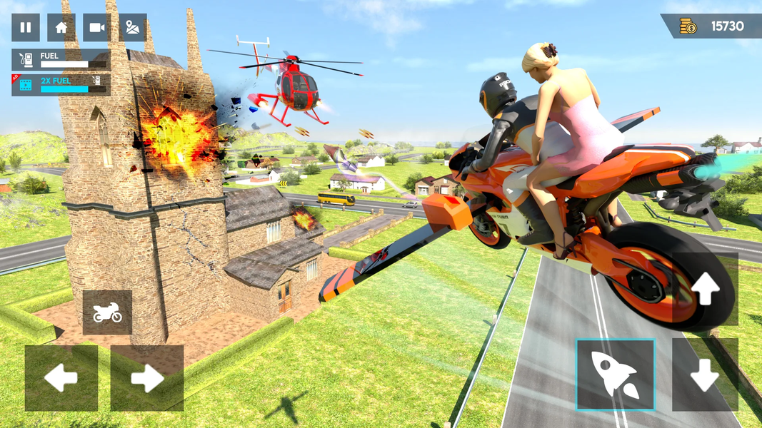 The flying motorbike is a marvelous turn in the bike driving game. It combines realism and fun riding physics to create an amazing motorcycle simulator on mobile with its advanced engine. Now you cannot only drive your bike but can fly in the highest skies leaving the busy streets of the city. One of the amazing motorbike flying simulators! Explore the beautiful world driving through streets or flying. In a sports bike simulator stunt mania racing game you can perform insane stunt actions to join the group of elite riders in the world championship of the motorbike simulator.