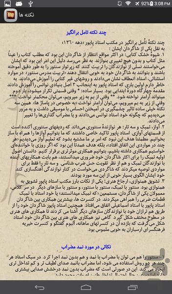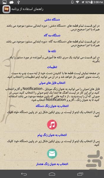 همچنین این برنامه شامل بخش نکته ها نیز می باشد که یک سری آموزش و نکته های جالب در مورد سنتور نوازی و ... در آن موجود می باشد.