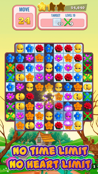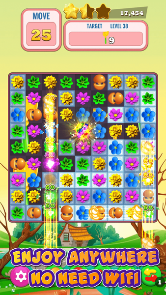 Match 3 or more flowers to get score, clean blocks...