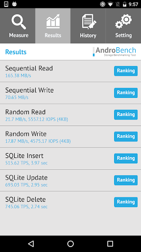 AndroBench is a benchmark application which measures the storage performance of your Android devices. AndroBench provides two kinds of benchmarks: Micro and SQLite. With the Micro benchmark, you can quickly compare the base performance of your storage device with those of other devices. The SQLite benchmark tests the performance of insert, update, and delete queries on a database table that mimics the one used in a messaging app. To obtain correct results, please minimize background activities while you run AndroBench. AndroBench is available for free and without any advertisement, and thus feel free to use it.