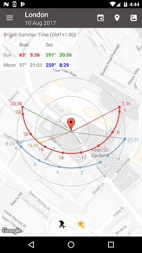 The app has a map view which plots the daily sun and moon path relative to your current location. It also contains a widget for your home screen showing sunrise/set times for the current day and your current location.