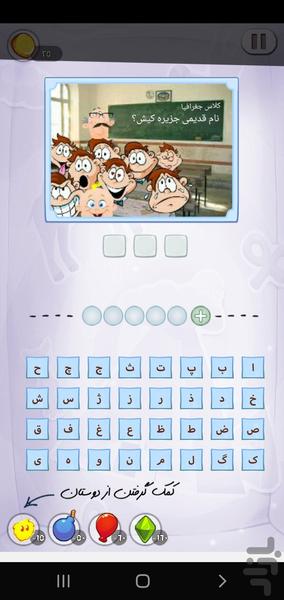 بنام خداوند جان و خرد در مدرسه کوشا معلم از دانش آموزان حاضر در کلاس سوالی را می پرسد و آنرا روی تخته مینویسد . ولی دانش آموزان هیچ کدام جواب سوال رو نمیدونند و همه رو به شما وپشت به معلم و تابلو کلاس با ادا و اطوار هایی از شما کمک میخوان که جواب رو بهشون بگین و گرنه تنبیه میشن .پس شما باید به کمکشون بیایید و جواب ها رو بگین تا هم امتیاز بگیرید هم به اونا کمکی کرده باشین . پس منتظر چی هستین ؟! تنبلا منتظرن برید ببینم چه کار میکنید براشون!!!