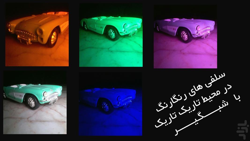 این اپلیکیشن ، هنگام سلفی گرفتن ، برای چند لحظه ، تمام صفحه نمایش گوشی را به رنگ انتخابی شما تغییر می دهد تا مشکل کمبود نور محیط با این کار برطرف شود.