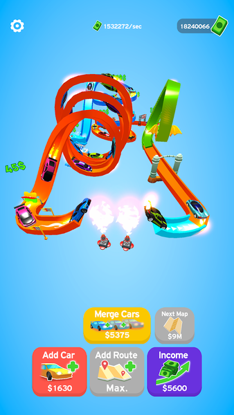 Collect money as your car goes round. Each obstacle or challenge a car hits will net you some bank. Grow your track and add more features to raise your income.