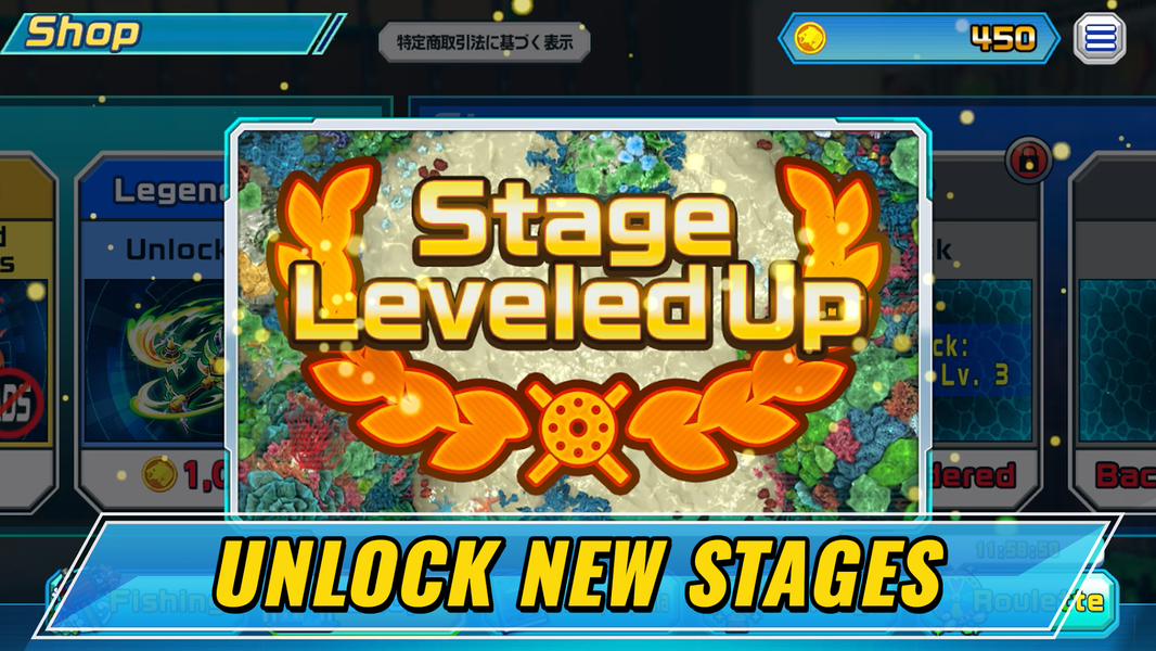 Test your fishing skills in a total of six stages, including Coral Reef, Deep Sea Ruins, Sunken Ship, and Deep Sea.