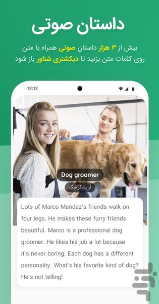 ۴. داستان انگلیسی صوتی : بیش از ۳ هزار داستان صوتی همراه با متن انگلیسی در ۱۴ سطح از آسان تا سخت. روی لغات متن داستان ها بزنید تا دیکشنری شناور معنای آن واژه را برای شما به صورت آفلاین پیدا کند.