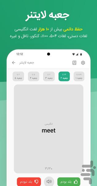 ۷. جعبه لایتنر : یادگیری لغات انگلیسی به صورت همیشگی و دائمی بدون فراموشی با سیستم لایتنر امکان پذیر است. آموزش واژگان انگلیسی با جعبه لایتنر زبان شامل لغات کنکور ، لغات تافل ، لغات ۵۰۴ ، لغات ۱۱۰۰ و... می باشد. امکان اضافه کردن لغات دستی و دلخواه نیز به جعبه لایتنر وجود دارد.