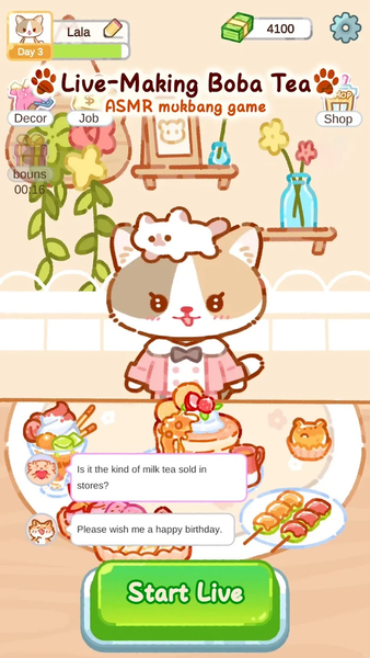 Welcome to Cat Boba Tea: ASMR Eating Mukbang, a delightful simulation game where you roleplay as me—a cute kitty chef chasing mukbang stardom through eating, cooking, and streaming.