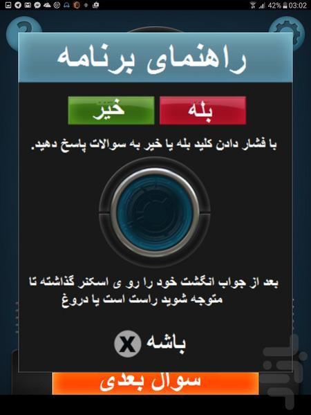 این برنامه یه دروغ سنج هست که توش یه سری سوال قرار داره و شما از دوستتون میخواین به سوال ها جواب بده اونموقت برنامه میگه دروغ میگه یا راست. (البته این برنامه جهت سرگرمی هست)