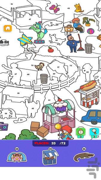 این بازی بینایی شما را برای تطبیق اعداد با برچسب های رنگارنگ به چالش می کشد. برای تکمیل سطح، اشیای کشف و پنهان را مطابقت دهید. هرچه بیشتر کتاب استیکر را بازی کنید، کار سختتر میشود و به شما زمان سختی میدهد تا سطح را بگذرانید و ساعتها شما را درگیر کنید، زیرا بسیار اعتیادآور است.