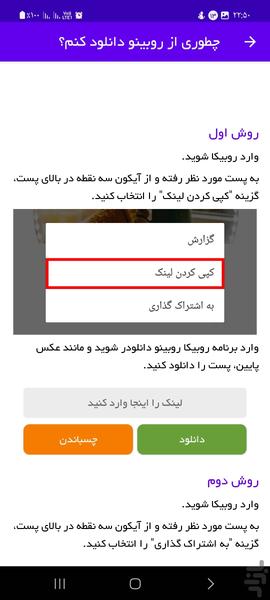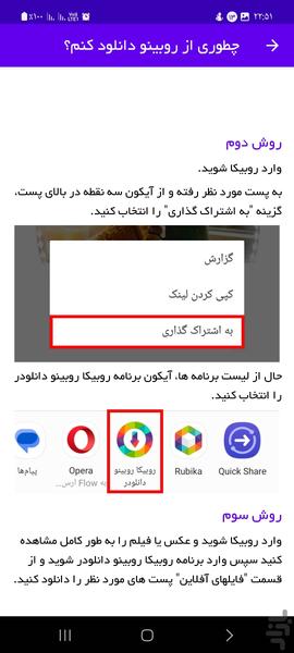 با برنامه دانلودر ویدیو از روبیکا به راحتی عکس و فیلم های روبیکا را دانلود و در دستگاه خود ذخیره کنید. برای اینکار کافی است که وارد برنامه روبیکا شوید و عکس ها و فیلم هایی را قصد ذخیره کردن آنها را دارید، را به طور کامل مشاهده و سپس وارد همین برنامه شوید و آنها را روی دستگاه خود ذخیره کنید.