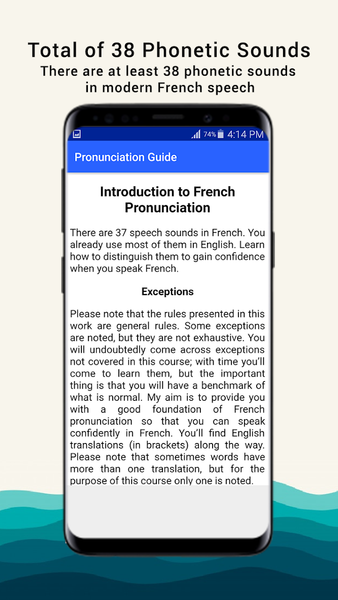 This is an ultimate French pronunciation guide with full offline support, for both students and teachers. The French Pronunciation app helps you learn, practice and play with French words. French Pronunciation app teaches you how to pronounce French text, words and or phrases properly. French pronunciation: learn to speak French, speak it right!