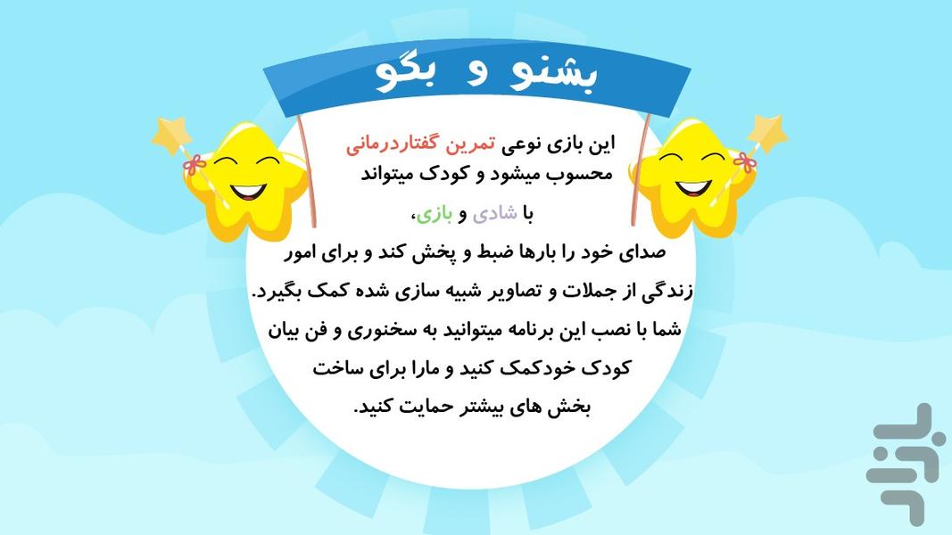 شما با نصب این برنامه می توانید به سخنوری و فن بیان کودک خود کمک کنید و ما را برای ساخت بخش های بیشتر حمایت کنید.