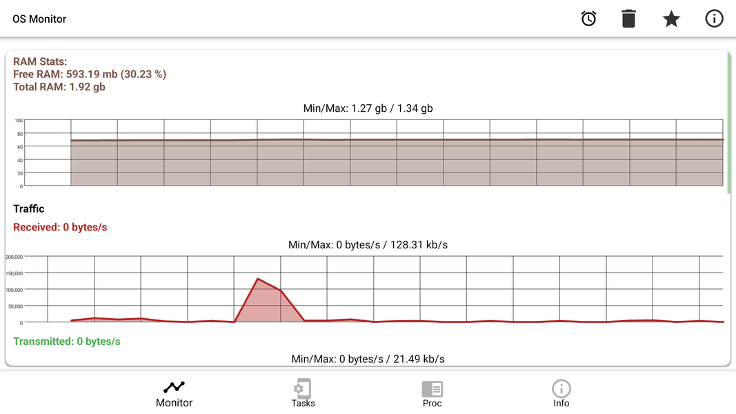 Powerful and simple monitoring app for your Android device. App shows a various system components and resources for example battery, cpu, ram disk usage, net manager. OS Monitor shows the processes, network incoming and outgoing traffic for applications that are running on your Android, so you can check status for system components and see how installed apps affect your device activity and performance.