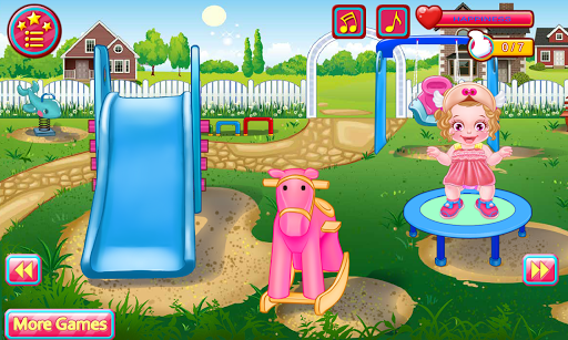 Play with your baby princess and have lots of fun in the play pen! Play with the ball, plane, car, spin top and more to make your baby smile. When she is happy and ready, move out into the park to play on the slide, swings, trampoline, and rocking horse. Remember a smiling baby is a happy baby!