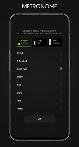 The count feature is also added to help you get familiar with the set BPM. Tap to select your tempo and start playing. The BPM will be counted automatically and your BPM will be tighter than ever. Besides, you can select the accent marker you want to modify and assign a volume and sound to it. There are 3 main options: knight, slap 1 and slap 2 and many smaller options in each. Tap on the note icon to change the accent marker you want and play it.