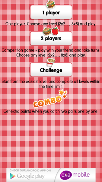 The game provide you at any level of an attractive brain training. Player can gain bonuses to compete for points, with time or other players. The current version of the game shows the cards of different kind of food. Examobile offer also other editions of memo games with the different graphics motives (animals, fruits, flags, vegetables, sports, football clubs and a lot of others).