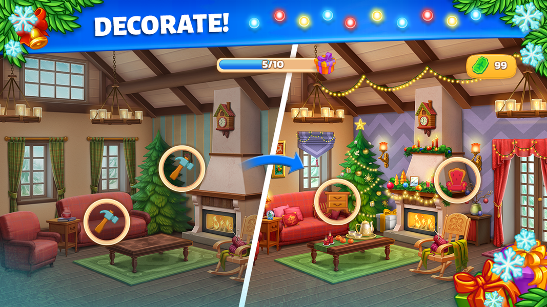 Merge & Design is a family game which uncover story of adventure, love and magic. Christmas is coming! Merge items, match tools and help Santa in his lovely home.