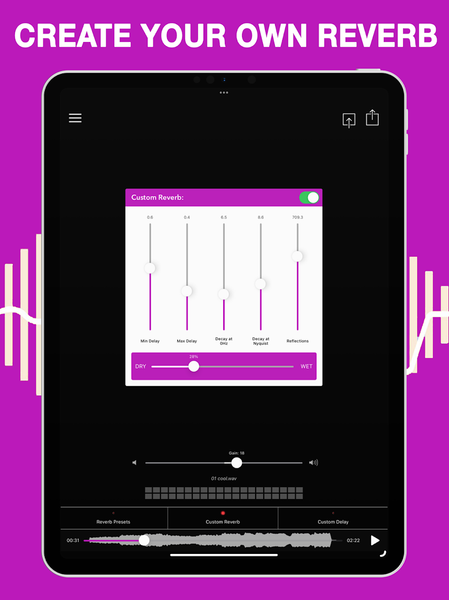 Import any audio recording and add reverb and/or delay to its sound. A must-have app for musicians, songwriters, instrumentalists and more. Choose from a variety of reverb presets or use the Custom Reverb and Delay to dial in your own sound to enhance your audio. You can also combine the reverb and delay to get a truly unique sound!