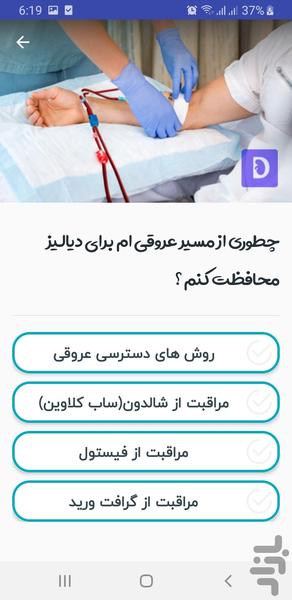 این اپلیکیشن آموزشی در جهت ارائه راهکارهایی جهت ارتقای خودمراقبتی و خودکارآمدی بیماران محترم تحت همودیالیز تهیه شده است. اپلیکیشن آموزشی در ماجول های مختلف آموزشی توسط پژوهشگران طراحی و تولید شد. در این اپلیکیشن اهداف آموزشی، دیالیز و مقدمه آن، تغذیه در بیماران کلیوی، روش های دسترسی عروقی، پیشگیری از عفونت، عوارض همودیالیز و پیشگیری از آنها، نحوه مصرف داروها و ورزش، خواب و مراقبت های جنسی در بخش های اصلی قرار گرفته اند. مددجو می تواند با ورود به هر بخش اطلاعات آموزشی و حزئیات آنها را مشاهده و مطالعه نماید. استفاده از تصاویر مناسب در اندازه های معین، پویانمایی و سرعت بالای پردازش از ویژگی های ممتاز این اپلیکیشن می باشد. براي سهولت دید و عملیات پیمایش از فونت بزرگ، کلیدهاي دستوري کمتر و در عین حال اشکال بزرگتر استفاده شد. کار با این اپلیکیشن در حالت خاموش ممکن بوده و نیازي به حالت آنلاین نخواهد داشت. امکان بروزرسانی، ارتباط با پژوهشگران و ارائه بازخورد و امتیاز به برنامه در اپلیکیشن گنجانیده شده تا سطح تعاملی مددجویان محترم با تیم پژوهشی میسر گردد.