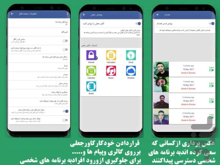در این برنامه علاوه بر امکان قفل کردن برنامه های شما(مثل وایبر و لاین وتلگرام و هر برنامه دیگه) به صورت کاملا حرفه ای، امکان گذاشتن کاور جعلی بر روی برنامه ها و امکان عکس برداری از افراد فضول و افرادی که بدون اجازه شما قصد ورود به گوشی یا برنامه های قفل شده را دارند نیز وجود دارد.