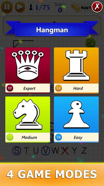 Hangman Word Game comes with 4 difficulty levels. Hangman is a word guessing game. You have to guess the word making as few mistakes as possible. The less mistakes, the bigger the score you will get.