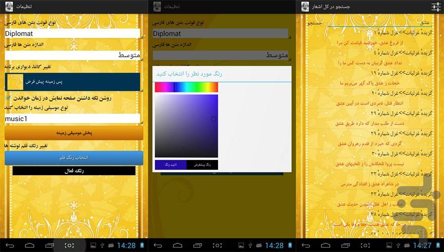 9- قابلیت ارسال شعر ها به عنوان SMS ، Email ، اشتراک به برنامه های دیگر ، بلوتوث (Bluetooth) و کپی متن در حافظه