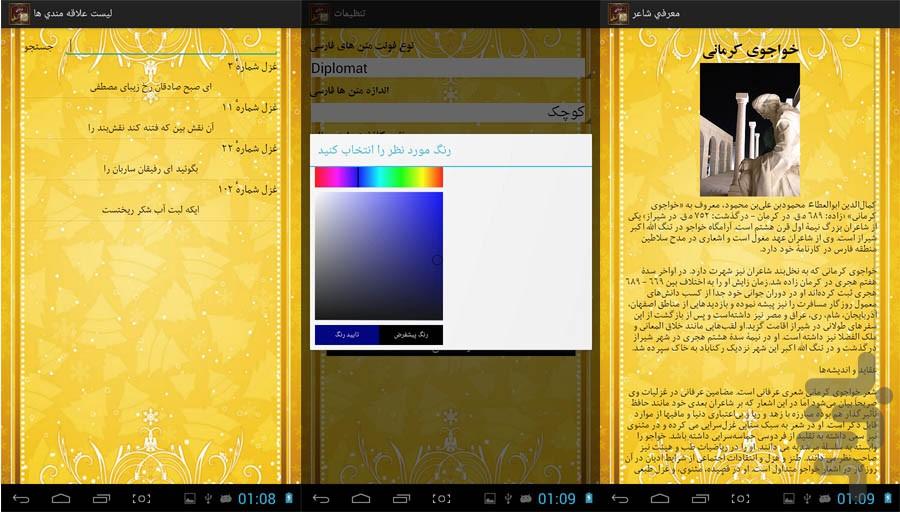 9- قابلیت ارسال شعر ها به عنوان SMS ، Email ، اشتراک به برنامه های دیگر ، بلوتوث (Bluetooth) و کپی متن در حافظه