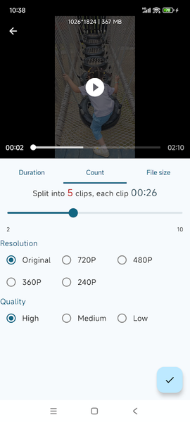 ✅ Split by Count – Enter the number of parts you need, and the app will split your video accordingly.