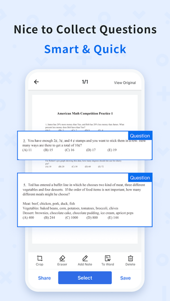 Use Quiz.AI to scan test papers and automatically remove handwriting and get a perfectly new, digital one. Select questions from your scans and organize them by subjects.