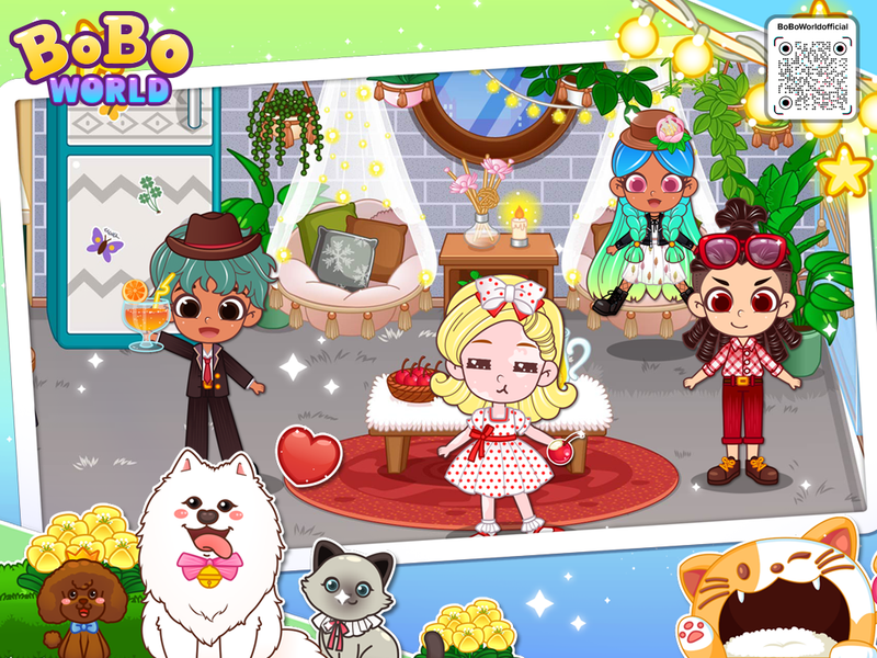 After the furniture is in place, invite your BoBo friends to your apartment for fun! Play house with your friends to have a birthday party, a sleepover, costume play or simply a dinner party. There are lots of costumes to play dress up and lots of food and ingredients for cooking. Create your life story and share with your family and friends!