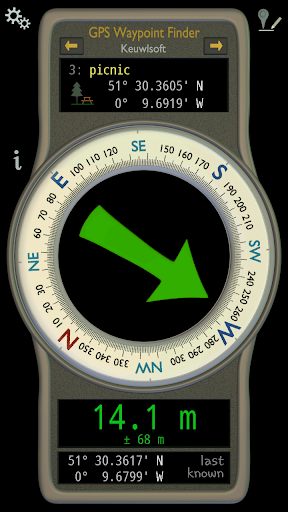Uses the GPS sensor, Magnetic Field Sensor and Accelerometer to determine the distance and direction to a GPS waypoint. Does not need to be held level.