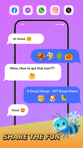 With Emoji Merge - DIY Emoji Maker, you'll experience the excitement of creating entirely new, unique, and fun emojis by combining your two favorite emojis. Emoji Merge - DIY Emoji Maker offers you hundreds of creative possibilities and over 50,000+ combined emojis to explore and share Emoji kitchen with your friends!