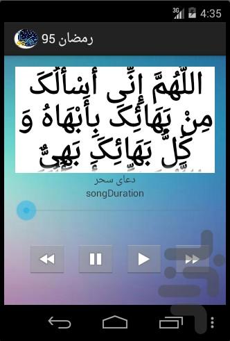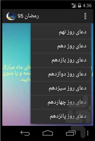 این اپلیکیشن، اپلیکیشن دعاهای ماه مبارک رمضان است،که شامل دعای روزهای ماه مبارک رمضان ،دعای سحر،دعای جوشن کبیر،و دعای قبل از افطار ماه رمضان می باشد.در این اپلیکیشن شما می توانید به صوت های زیبایی که از دعاهای ماه رمضان گرد آوری شده گوش دهید ولذت ببرید.در بالای صفحه قسمتی سه نقطه به صورت منو تعبیه شده است که شما می توانید با انتخاب آن ، بخش مورد نظر خود را انتخاب نمایید.