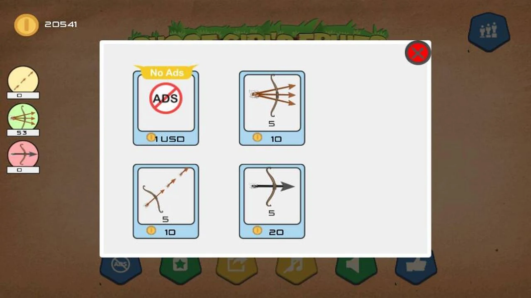 - If you shoot down fruits or the birds you will get 1 score & 1 coin but make sure not to let the birds take away three fruits else game over.