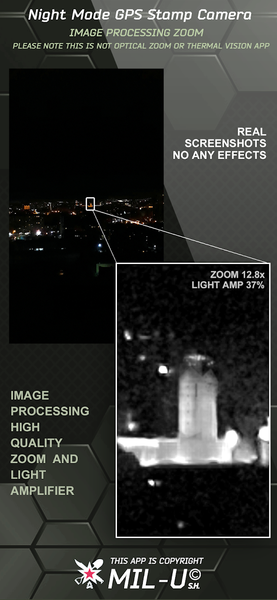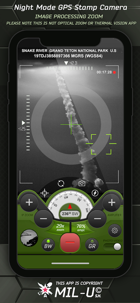 GPS Stamp Camera Compass with Zoom and Night Mode. Includes viewing address, location, course, coordinates, angle levels.