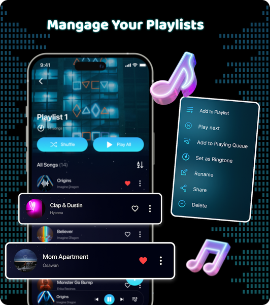 Organize your music effortlessly with our powerful playlist management feature. Create, edit, and delete playlists to suit your preferences and keep your music library tidy.