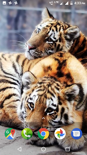 These majestic striped cats are the largest felines in the world - bigger even than lions, leopards and jaguars! The classic tiger fur pattern is that of the Bengal tiger, featuring a tan to orange body with black stripes and white highlights on the belly and face. The backgrounds in this app feature stunning images of tigers, highlighting the varied facial expressions and body language these cats exhibit. In some of the images, the tigers gaze serenely at the camera much like giant housecats, while in other images they show their power and aggression through narrowed eyes and bared fangs. From full grown adults to little cubs, tigers are incredible, solitary animals that are usually only seen in zoos or photographs like these.