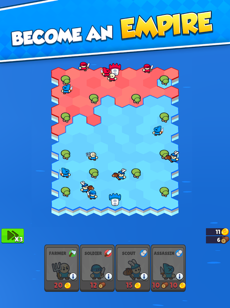Lead your tiny villagers to gather resources, claim tiles, and grow your army. Every choice matters as you strategize to outsmart opponents and dominate the battlefield. Will your tactics bring victory?