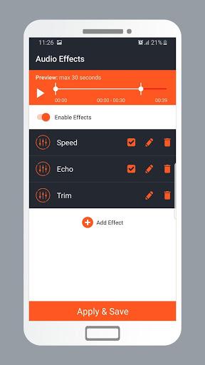 ✓ Add many effects to any sound like Echo, Delay, Speed, Fade in/Fade out, Bass, Pitch, Treble, Chorus, Flanger, Earwax effect.