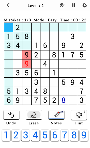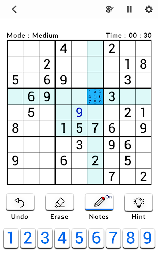 Sudoku classic is a logic-based, combinatorial number-placement puzzle game. You need to fill a 9x9 grid with digits so that each column, each row, and each of the nine 3x3 sub-grids that compose the grid contains all of the digits from 1 to 9 to win the game.