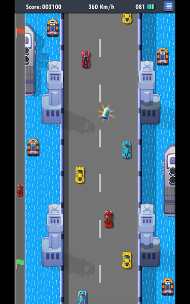 The player's speed is automatic increase to 360 km/h. The player has a limited amount of battery and can earn more by collect battery on the road. If the player crashes into the side barriers, the car will explosion and loss some battery unit.