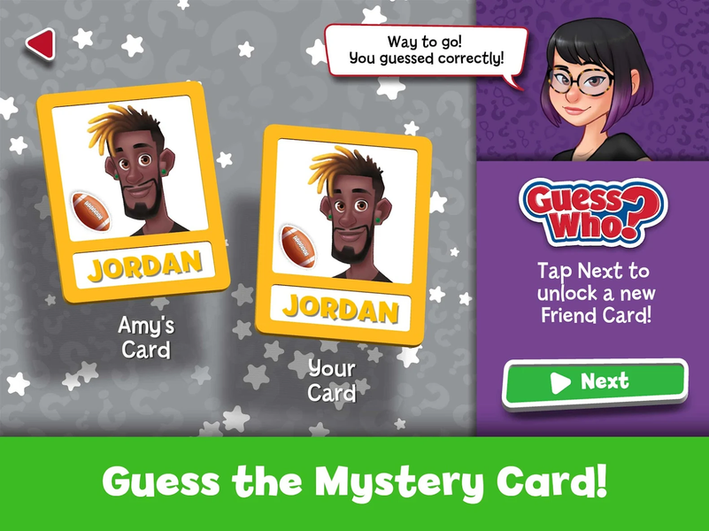 In the GUESS WHO? app, you get to play with each of the 6 classic characters from the board game – Amy, Al, Sofia, Sam, Emma and Jordan - as you try to guess the mystery character using yes or no questions. Do they have brown hair? Do they wear glasses? Do they like sports? Remove cards that don’t match through process of elimination. When you think you know the correct card, makes a guess! The more you more play, the more character cards you will discover. Enjoy fun facts and inspirational messages as you make your way through the app.