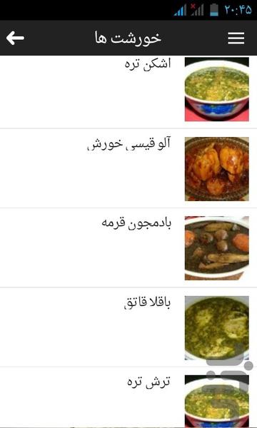 دارای ده ها دستور پخت مثل خورشتها- خوراکها- کباب ها- پلوها- ماهیها- ترشیها- مرباها و ...